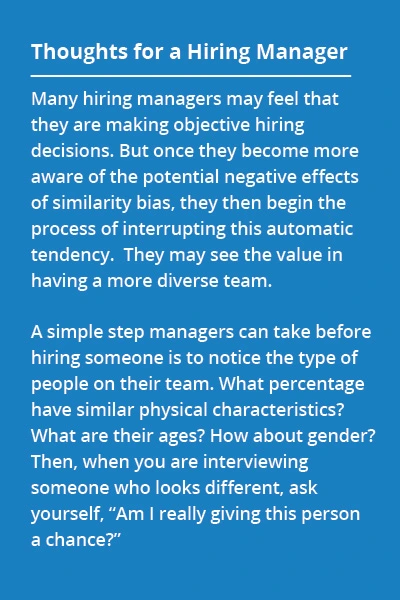 Similarity bias can be problematic and even harmful when we treat in-group members favourably and at the expense of others viewed as out-group members. For example, if a hiring manager engages in similarity bias, there is a greater chance the manager will hire individuals perceived to be similar and much less likely to hire individuals thought to be dissimilar, regardless of qualifications.